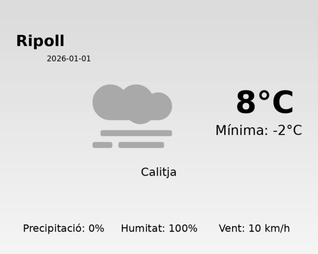 En resum, Ripoll experimentarà un primer dia de l’any 2026 sense pluja però amb fred hivernal. Aquells que vulguin gaudir de l’aire lliure, haurien de preparar-se per a un dia molt humit i ventós. Gaudiu del primer dia de l’any!