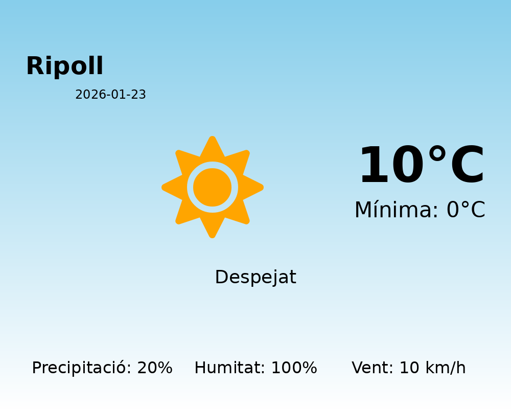 Avui a Ripoll, es preveu un dia marcat per la humitat elevada i un cel majoritàriament ennuvolat. La temperatura màxima arribarà fins als 10°C, mentre que la temperatura mínima es mantindrà al voltant dels 0°C. Aquesta combinació de temperatures suggereix un ambient fred, especialment durant les primeres hores del matí i a la nit.