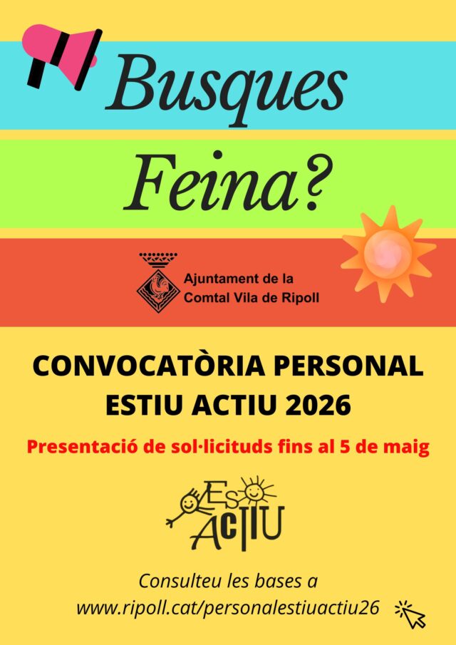 L’Ajuntament de Ripoll ha obert el procés de selecció de personal per a les activitats de lleure adreçades a infants i joves en el marc del programa ESTIU ACTIU 2026. Les posicions disponibles inclouen: