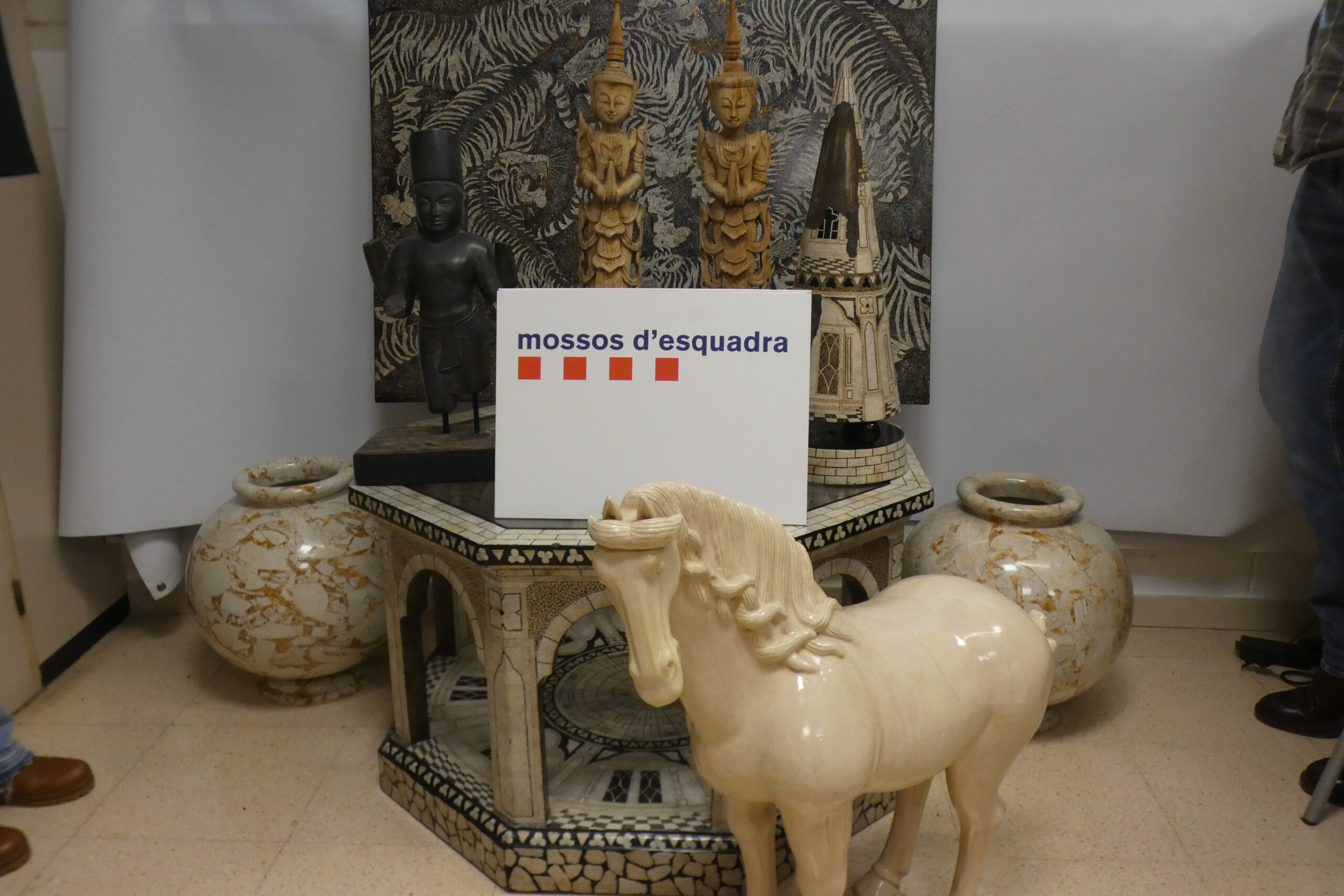 N’hi havia una de marbre i de bronze valorada en uns 600 euros, una taula de nacre i craquejada de 1.600 euros, una figura en forma de con de nacre i craquejada d’uns 400 euros, un cavall de porcellana blanca valorat en 700 euros, dos gerros de marbre d’uns 400 euros, i dues figures de fusta tallades a mà d’estil tailandès d’uns 400 euros.