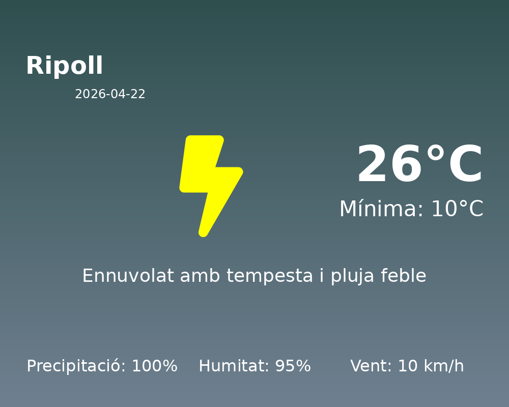 En conclusió, avui a Ripoll tenim un dia en què la pluja serà la protagonista, així que estigueu preparats per gaudir d’un dia passat per aigua amb les temperatures típiques d’una primavera catalana.