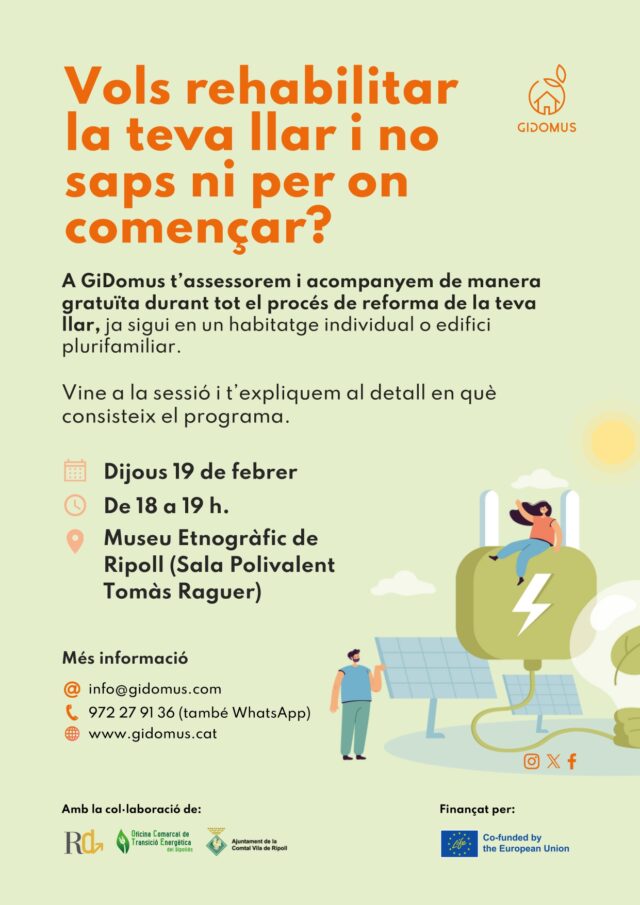 GiDomus és un servei integral i gratuït que ajuda a les comunitats de propietaris i a les famílies que desitgen rehabilitar energèticament els seus immobles. Aquesta sessió tindrà lloc el 19 de febrer, al Museu Etnogràfic de Ripoll de 18 a 19 h.