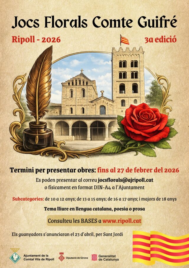 El 2026, l’Ajuntament de Ripoll organitza la tercera edició dels Jocs Florals Comte Guifré, amb l’objectiu de promoure la creació literària i l’ús de la llengua catalana, mentre dinamitzem l’activitat cultural del municipi. Aquest esdeveniment literari inclou dues categories: poesia i prosa, amb la participació oberta a qualsevol català, no només a residents ripollesos.